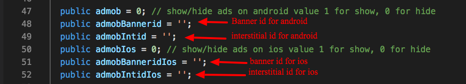 Now update the src/providers/configProvider/config.ts file . Add your ios and android ids below and then also change the value of admob =1 for android ads and admobIos = 1 to enable the ios ads.