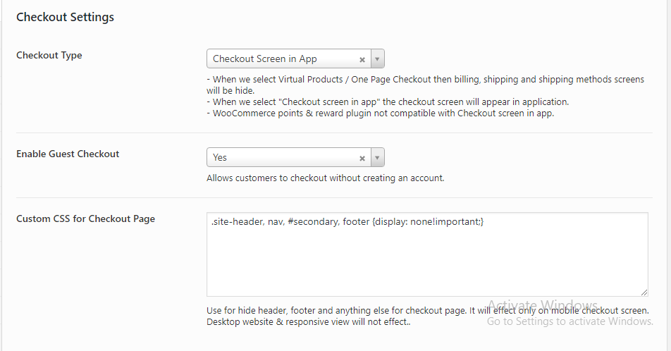 - Default: by selecting this option, you allow the web view of checkout. This checkout option appears in your app.